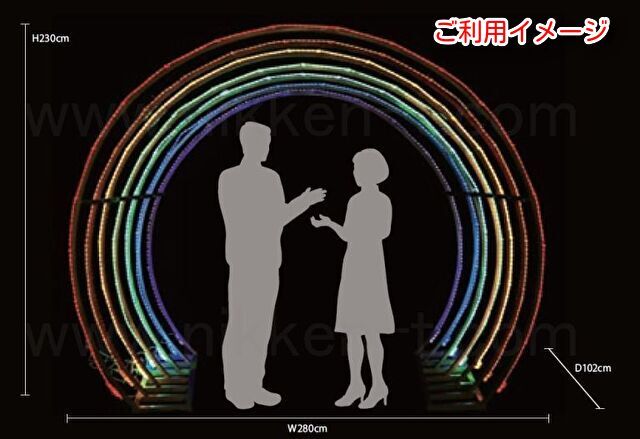 ※在庫限り特価品 ◆横280×高さ230×奥行102cm レインボー・アーチ ◆LED1,408球 豪華仕様 LED色 (レッド・アンバー・シャンパンゴールド・グリーン・パステルブルー・ブルー・パステルパープル) 奥行が約1mあり、カラフルな光のトンネルになります ◆商業施設、イベントのフォトスポットにおすすめです ◆ベース(スタンド付)組立必要です ※在庫表示については常時「無し」表示としております 在庫状況はお問い合わせくださいませ 代引き不可品です。 ※大型品のため、お届け地域により送料が異なります。お問い合わせくださいませ。
