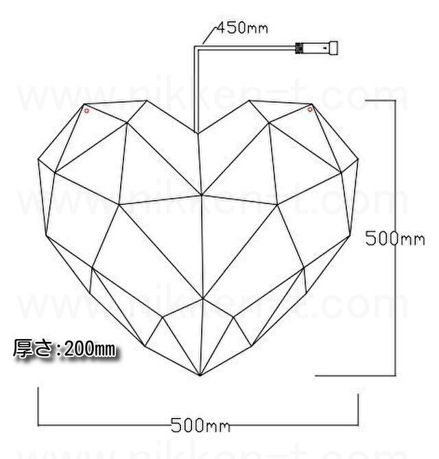 ※電源、接続備品別売り ホログラム13 ハート50 サイズ:W50×H50×D20cm 重量:250g ハート型 ホログラム仕様 モチーフライト ※注)電源(24V60Wトランス Ver.S)、メインコード等備品類は別売りです。 ※在庫・納品可能時期については問合せください。 ※消費電力:2W 常時点灯 防滴仕様 ◆イルミネーションイベント、商業施設装飾などに! ◆LED96球仕様 ホワイト球