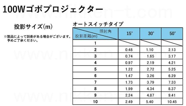 LEDゴボプロジェクター オートスイッチタイプ リモコン制御 100W 防滴仕様 ※受注生産品 ゴボデザインデータ送付要 イルミネーションイベント、店舗用看板、広告用途におすすめです。 「オートスイッチタイプ100W」は3~7枚のゴボが順に壁面や床面(地面)へ照射し、3~7種類の内容を道行く人へのPRにご使用いただけます。ゴボは回転しません。 (他には1枚のゴボを回転照射可能なローテートタイプがございます) 付属するリモコンで動作を制御するモデルです (別モデルでDMX制御モデルもございます)。 オリジナルデザイン(お客さま作成)データ(原則PDFファイル)3~7枚分を弊社へ送付いただき、オリジナルデザインのゴボ(スライドプロジェクターでいうところのスライドフィルム)を制作致します。 ※注)送付いただくデータには「円形枠」をつけてください。 納期は、ゴボデザインデータ確認後、3~4週間程度です。 ゴボデザインデータに不備がある場合、弊社よりご連絡致します。 注)受注生産品のため、ご発注後のデザイン変更は不可となります。 高出力100Wモデル (他に40、60、80、150、200、300、400Wモデルがございます。) ゴボ切り替え間隔時間調整が可能です。 明るさ調整できます。一定間隔でフラッシュ点灯も可能です。 機器スペック LED:100W (Osram) 入力電圧:AC100V 専用アダプタ付 サイズ:310 × 210 × 260 [mm] 重量:5.2kg 照射角:15° (オプション追加料金で30°、50°可能) 照射距離・投影サイズ目安:30m以内/ φ7.8m以内 ゴボサイズ:Φ45mm, 有効φ30mm 3~7枚 防塵防滴性:IP65 リモコン付属 レンズ角 標準15° → 投影距離:投影サイズ = 1:0.26 オプション30° → 投影距離:投影サイズ = 1:0.55 オプション50° → 投影距離:投影サイズ = 1:0.93 ※注意事項)他社品との互換はございません。